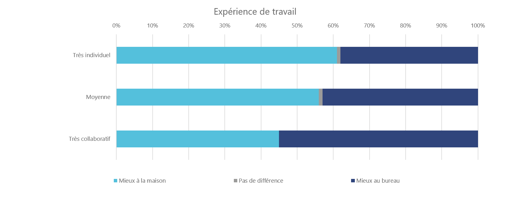 Wenn Sie die kollaborativsten Profile nach ihrer Rückkehr ins Büro befragen, werden sie Ihnen sagen, dass es "schöner ist, sich in Wirklichkeit zu sehen, es ist nicht dasselbe". Sie werden sich darüber beschweren, dass die Besprechungen wieder zu spät kommen (im Gegensatz zu virtuellen Besprechungen) und dass es schwierig ist, hybride Besprechungen (halb Präsenz, halb Fernwartung) abzuhalten. Insgesamt haben sie den Eindruck, dass sie im Büro genauso effizient sind wie im Homeoffice (mit Nuancen je nach Profil und Rolle). Eine von Leesman durchgeführte Studie veranschaulicht dieses Ergebnis: Während 61 % der individuellen Mitarbeiterprofile der Meinung sind, dass sie zu Hause ein besseres Arbeitserlebnis haben, sind 55 % der kollaborativeren Mitarbeiterprofile der Meinung, dass sie im Büro ein besseres Arbeitserlebnis haben.