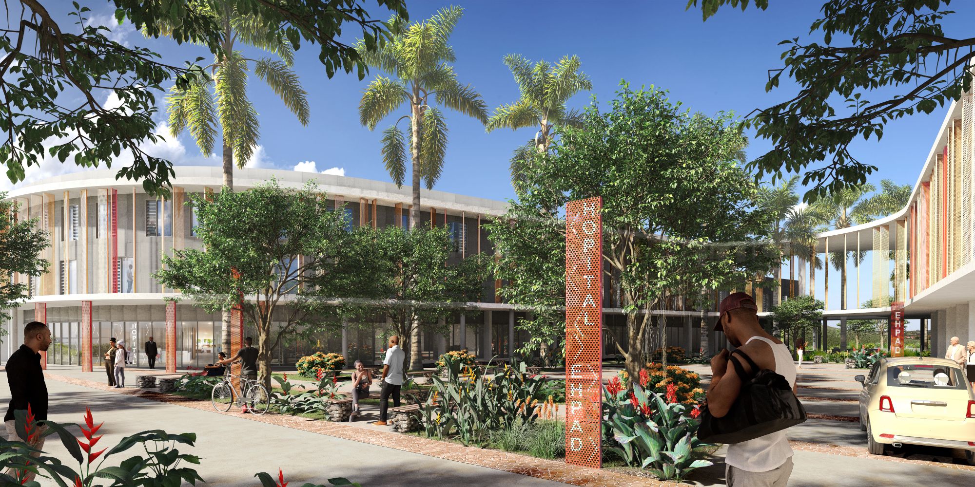 Le parvis, large espace d’accueil dédié aux rencontres, au repos et à la flânerie, est surligné par des arbres d’ombrages d’essences locales et par un alignement de palmiers royaux invitant à pénétrer au coeur du projet et à découvrir le jardin créole en fond de perspective. Ce jardin valorisera la pharmacopée martiniquaise (Chadwon béni, le Ponpon soldat, le Brizé, le Fléri nwel, etc.).