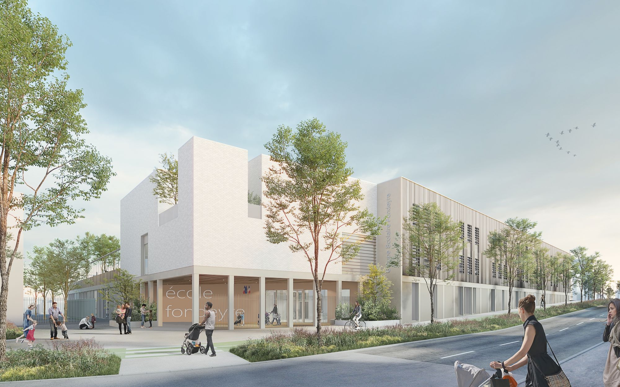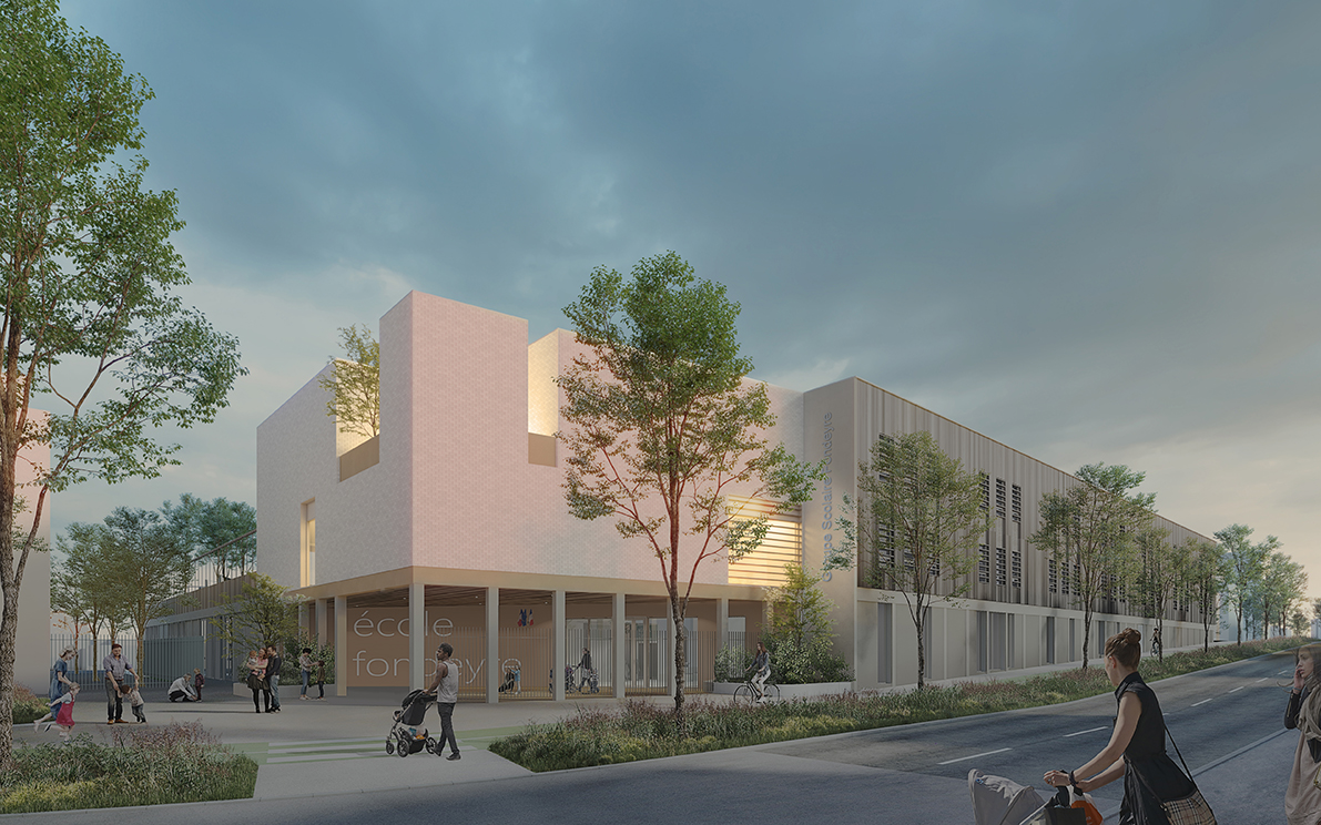 L’architecture scolaire est un outil pédagogique qui doit favoriser l’épanouissement de l’enfant, sa culture, et sa socialisation. Le modèle traditionnel d’école « caserne » laisse aujourd’hui place à celui d’école « village », intégrée dans son paysage et respectueuse de l’environnement. Cette vision poétique d’une école village nous a particulièrement séduits pour un quartier situé sur une ancienne plaine maraîchère.
